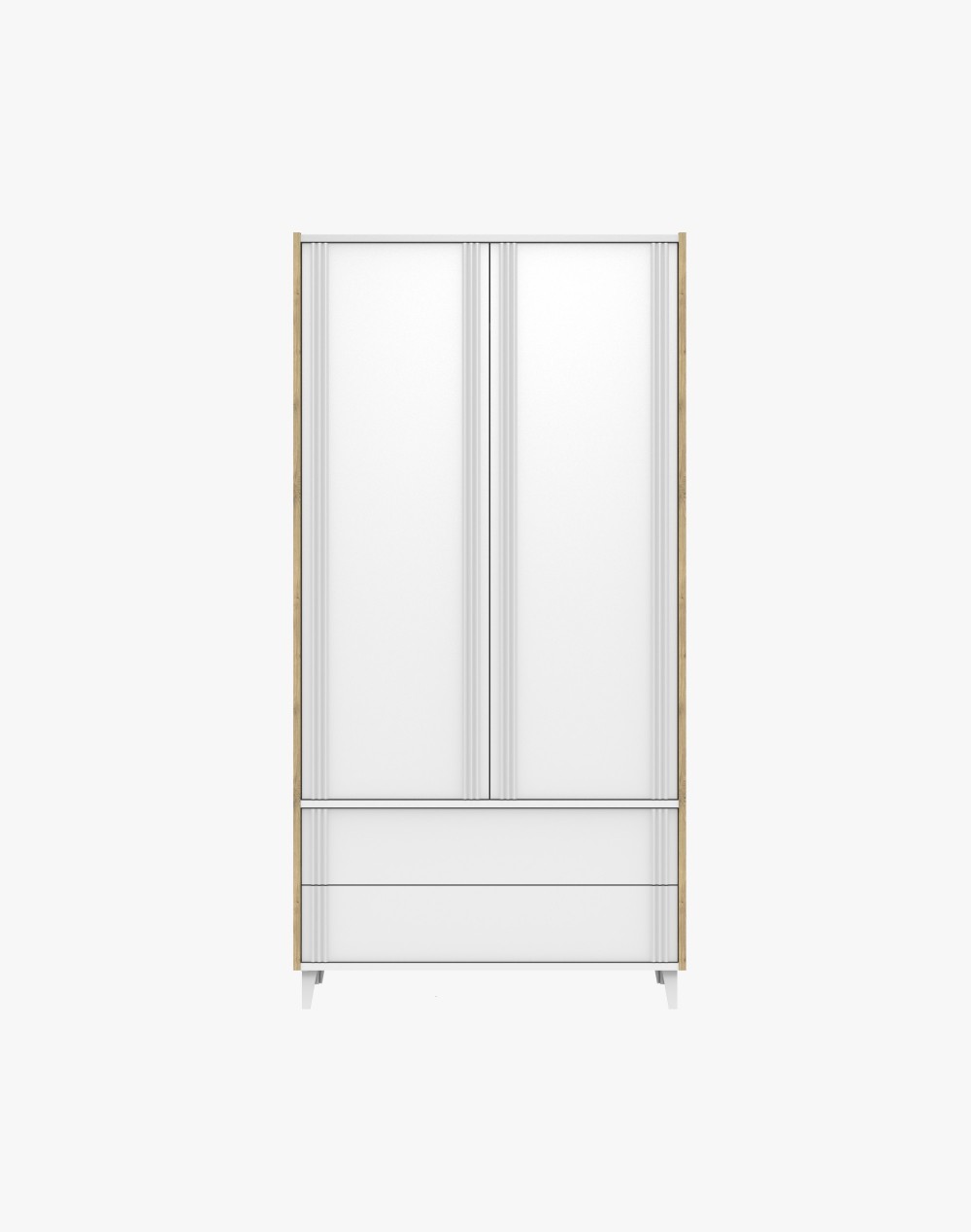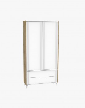 Duża szafa wykonana została z solidnej płyty meblowej w kolorze naturalnego dębu. Metalowe fronty posiadają niepowtarzalny wzór harmonijki, który wyróżnia mebel spośród wszystkich mebli dostępnych na rynku. Dąb naturalny łączymy z bielą lub grafitem, by łatwiej Ci było wybrać szafę pasującą do wystroju Twoich wnętrz. Bezuchwytowy system otwierania ("push-to-open") pozwolił nam zachować czystość formy.