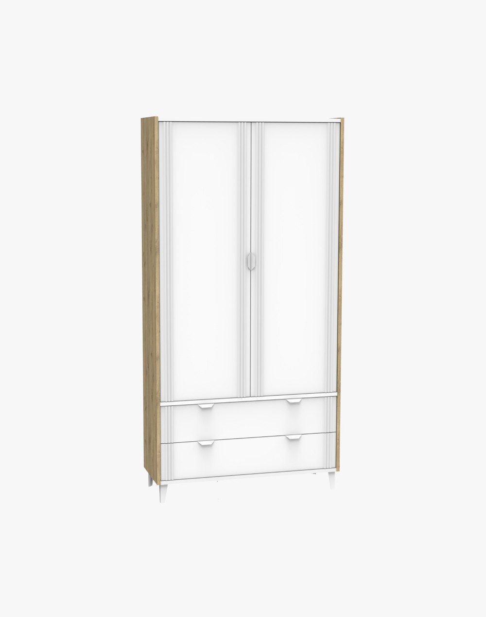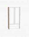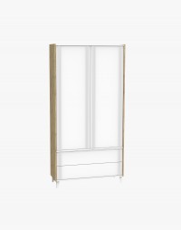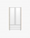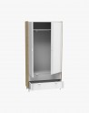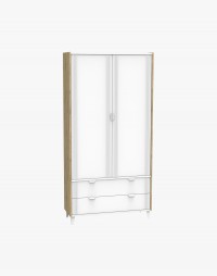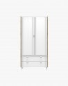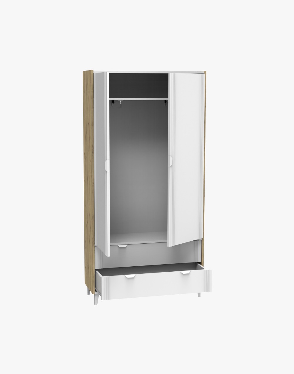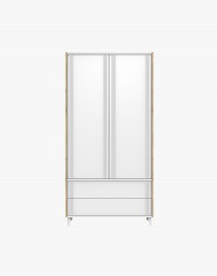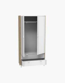 Szafa posiada bardzo praktyczne rozwiązania. Wyposażona została w półkę oraz dwa wysuwne drążki na ubrania. W dwóch szufladach schowasz te ubrania, które nie wymagają powieszenia na wieszakach. Ustawienie konstrukcji na ukośnych nóżkach dodaje meblowi wrażenia lekkości.