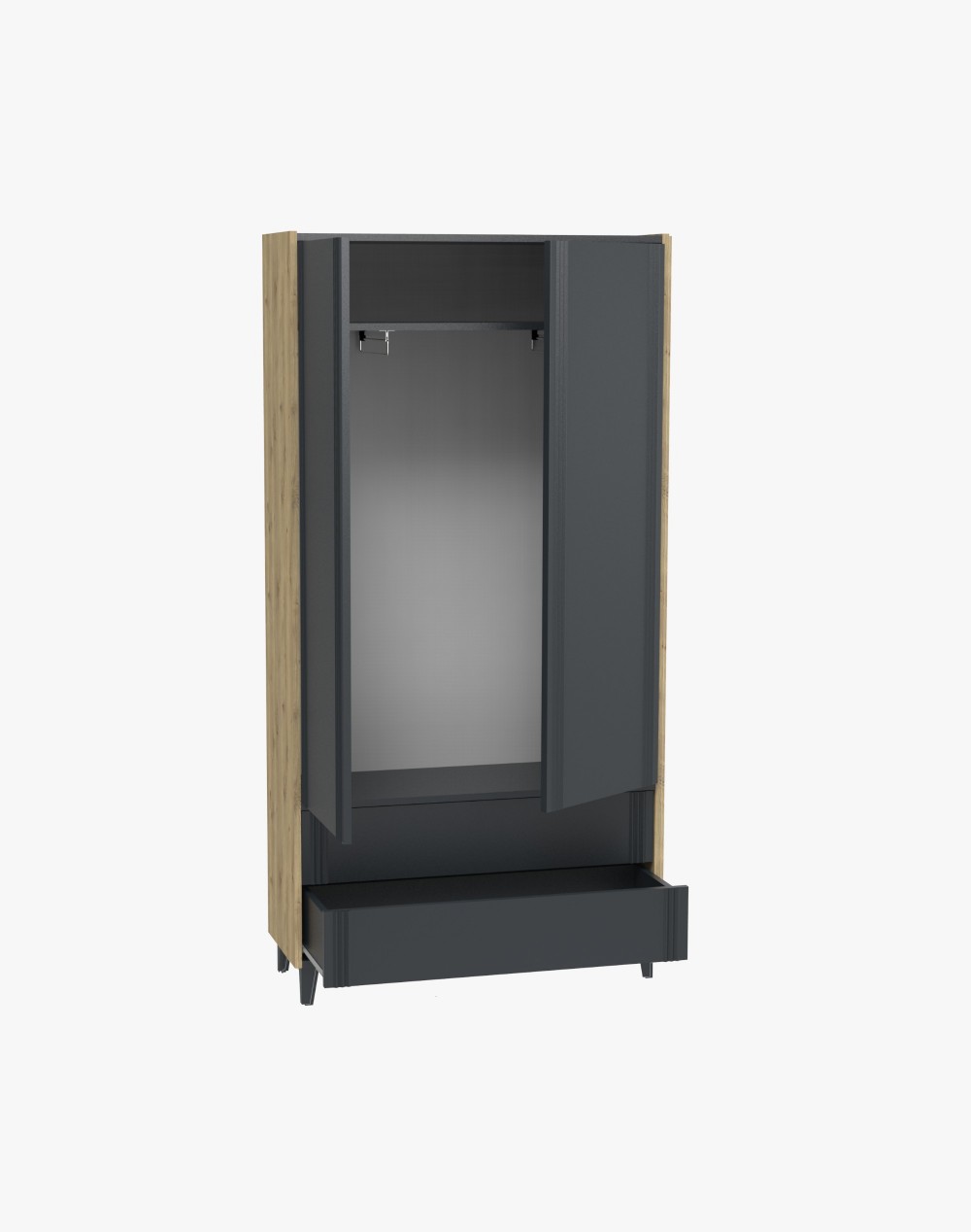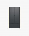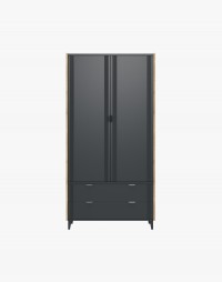 Szafa posiada bardzo praktyczne rozwiązania. Wyposażona została w półkę oraz dwa wysuwne drążki na ubrania. W dwóch szufladach schowasz te ubrania, które nie wymagają powieszenia na wieszakach. Ustawienie konstrukcji na ukośnych nóżkach dodaje meblowi wrażenia lekkości.