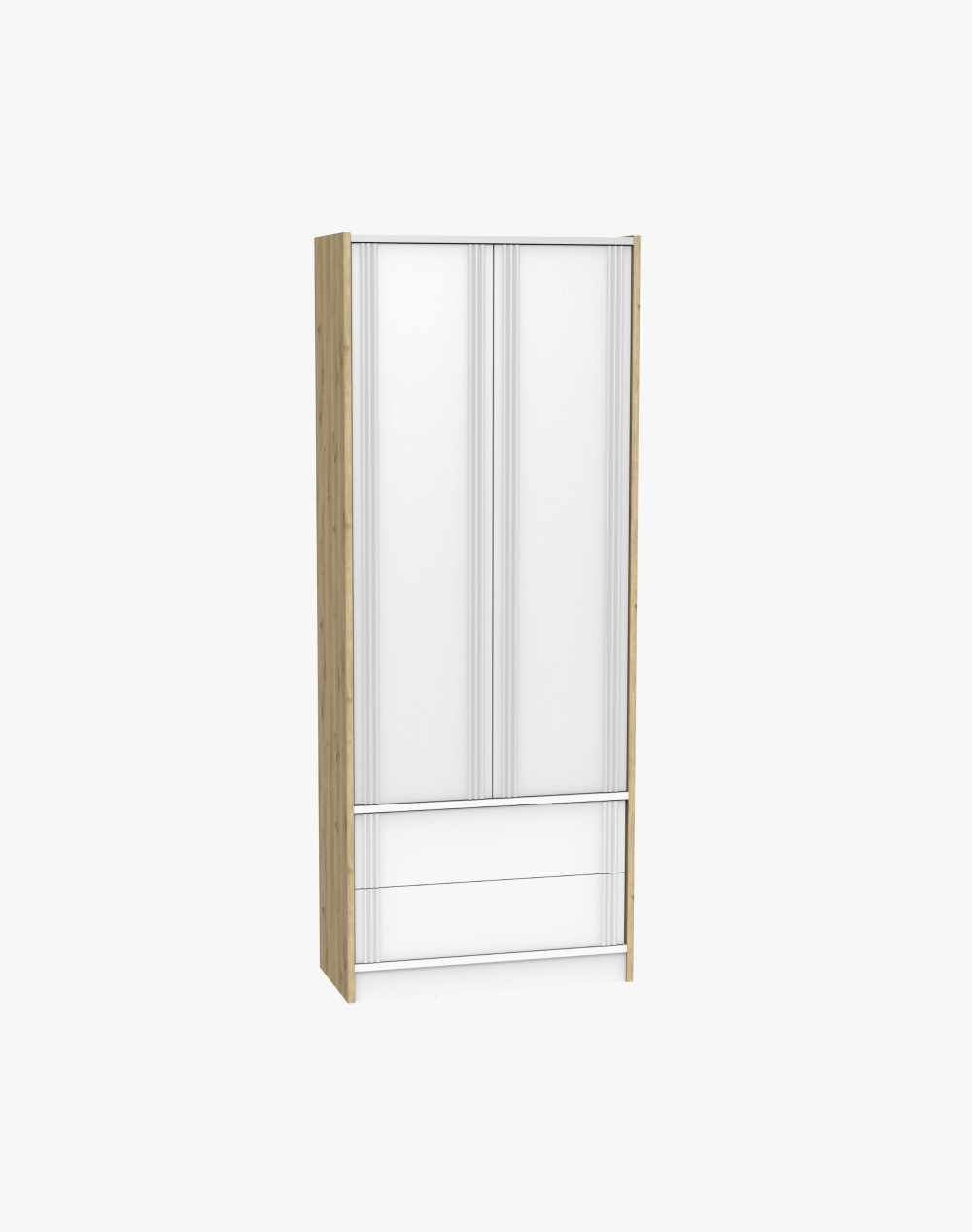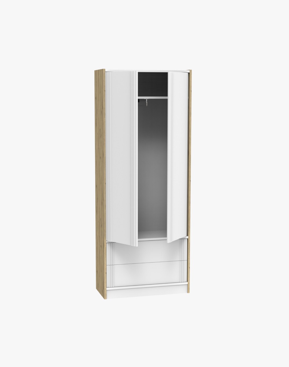 Korpus szafy wykonany został z solidnej laminowanej płyty meblowej w kolorze naturalnego dębu. Ten klasyczny odcień drewna zestawiamy z metalowymi frontami w kolorze białym lub grafitowym - jest to połączenie, które nie będzie ulegać zmiennym kaprysom mody. A we wnętrzu szafy do dyspozycji masz pojemną półkę, drążek wysuwny na wieszaki oraz dwie szuflady. Jest to mebel, który doskonale spisze się w przedpokoju czy sypialni.