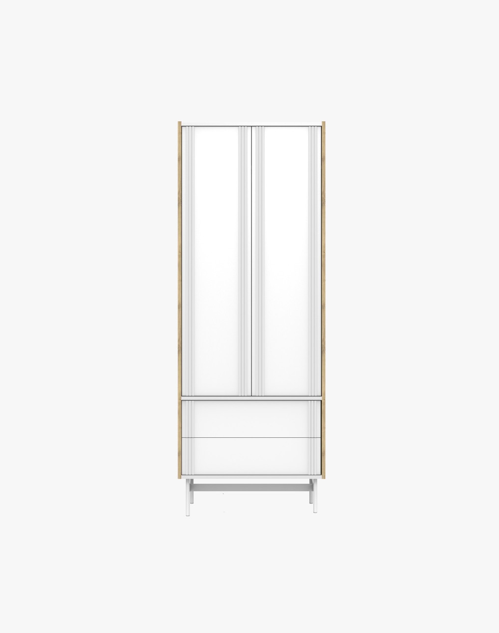 Elegancka, praktyczna szafa z kolekcji GROOVES do mniejszych przedpokoi czy sypialni. Podparta została na okrągłych nóżkach, które dodają jej wrażenia lekkości i designu. Niepowtarzalny wzór na frontach przypominający harmonijkę nie pozwoli przejść obok niej obojętnie.