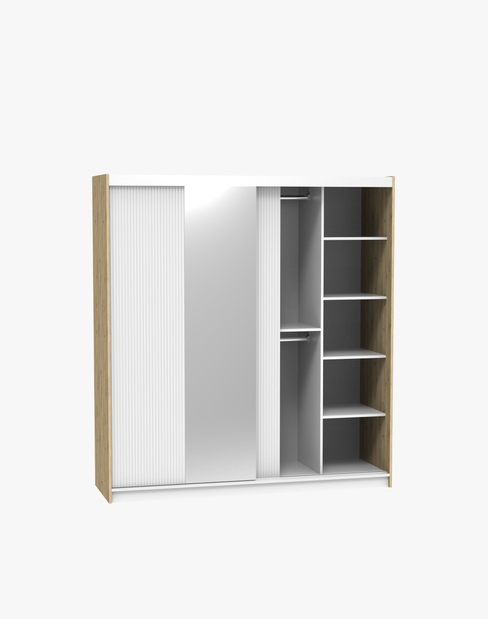 Szeroka szafa z drzwiami przesuwnymi i lustrem z kolekcji GROOVES to bardzo pojemny mebel i do nowoczesnego przedpokoju, i sypialni. Posiada osiem półek i dwa drążki na wieszaki. Funkcjonalność i niepowtarzalny design dla wymagających.