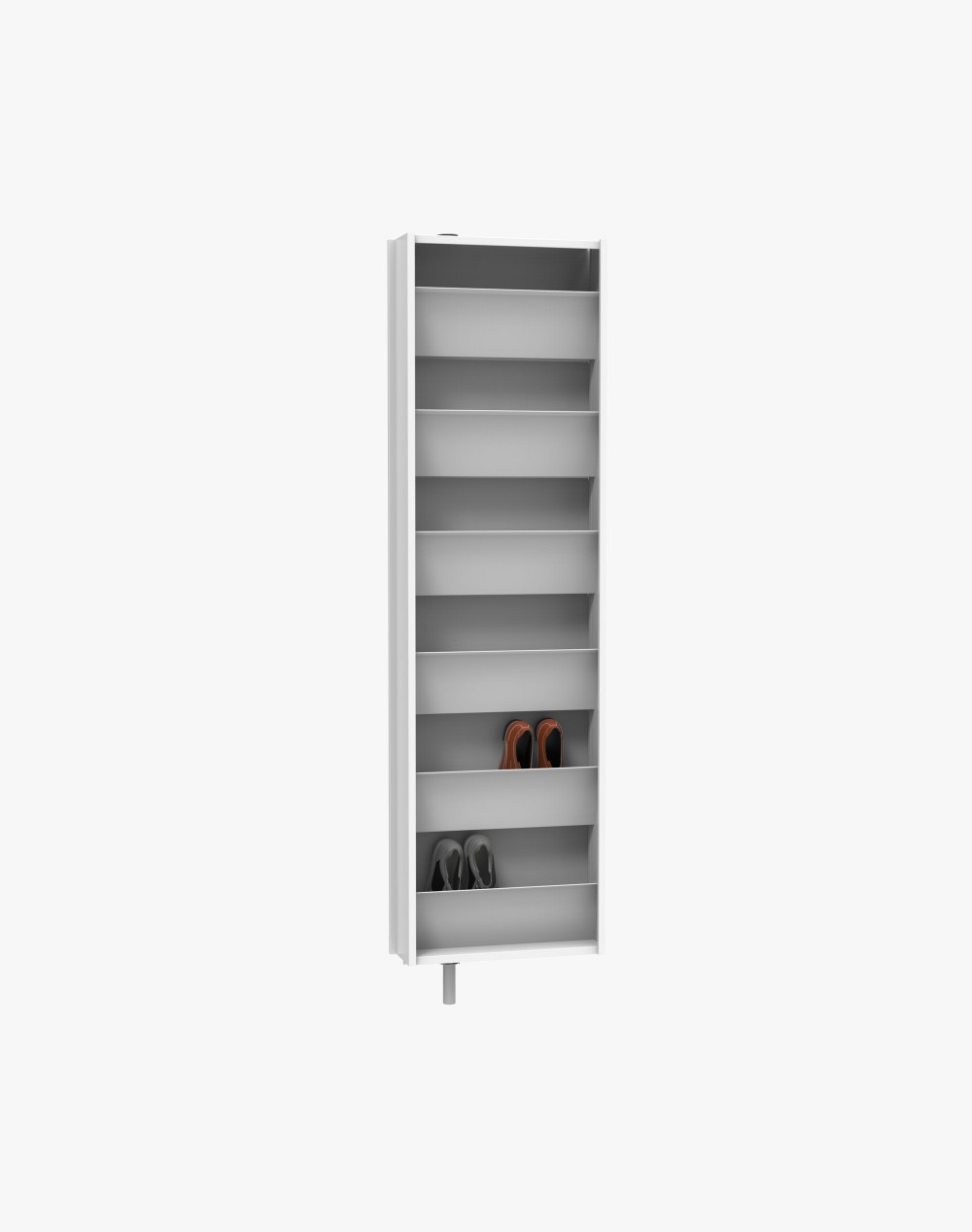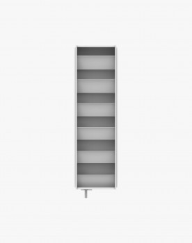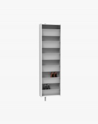 Metalowa szafa obrotowa zastępująca tradycyjną szafkę na buty wyposażona została w lustro na froncie, by jeszcze efektywniej wykorzystać cenną przestrzeń małego przedpokoju. Metalowa konstrukcja szafy wsparta jest na delikatnej nóżce, która sprzyja wrażeniu lekkości. Wnętrze obrotówki skrywa sześć pojemnych półek do przechowywania obuwia. Z tą szafą utrzymanie przedpokoju w odpowiednim porządku będzie łatwiejsze niż dotychczas. Dostępna jest w kilku kolorach do wyboru.