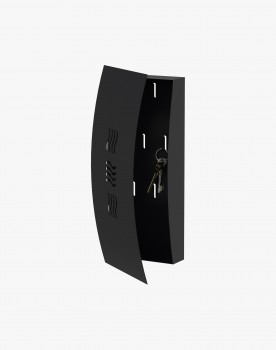 Szafka na klucze posiada delikatnie profilowane drzwiczki z wyciętym niewielkim wzorem. Zamykana jest na magnesik, by drzwiczki skutecznie ukrywały zestawy kluczy przed wzrokiem gości i dawały wrażenie estetycznego porządku.