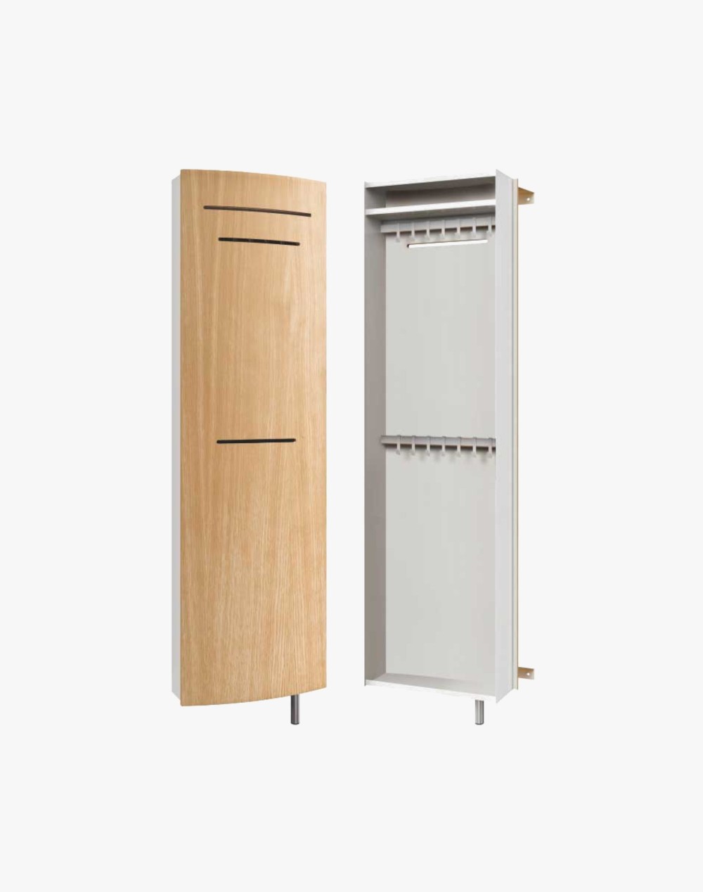 Szafa posiada metalowy korpus, który malujemy na biało, i front z formowanej sklejki. Możesz wybrać szafę z białym lub dębowym frontem. Nóżka podpierająca konstrukcję dodaje meblowi wrażenia lekkości.